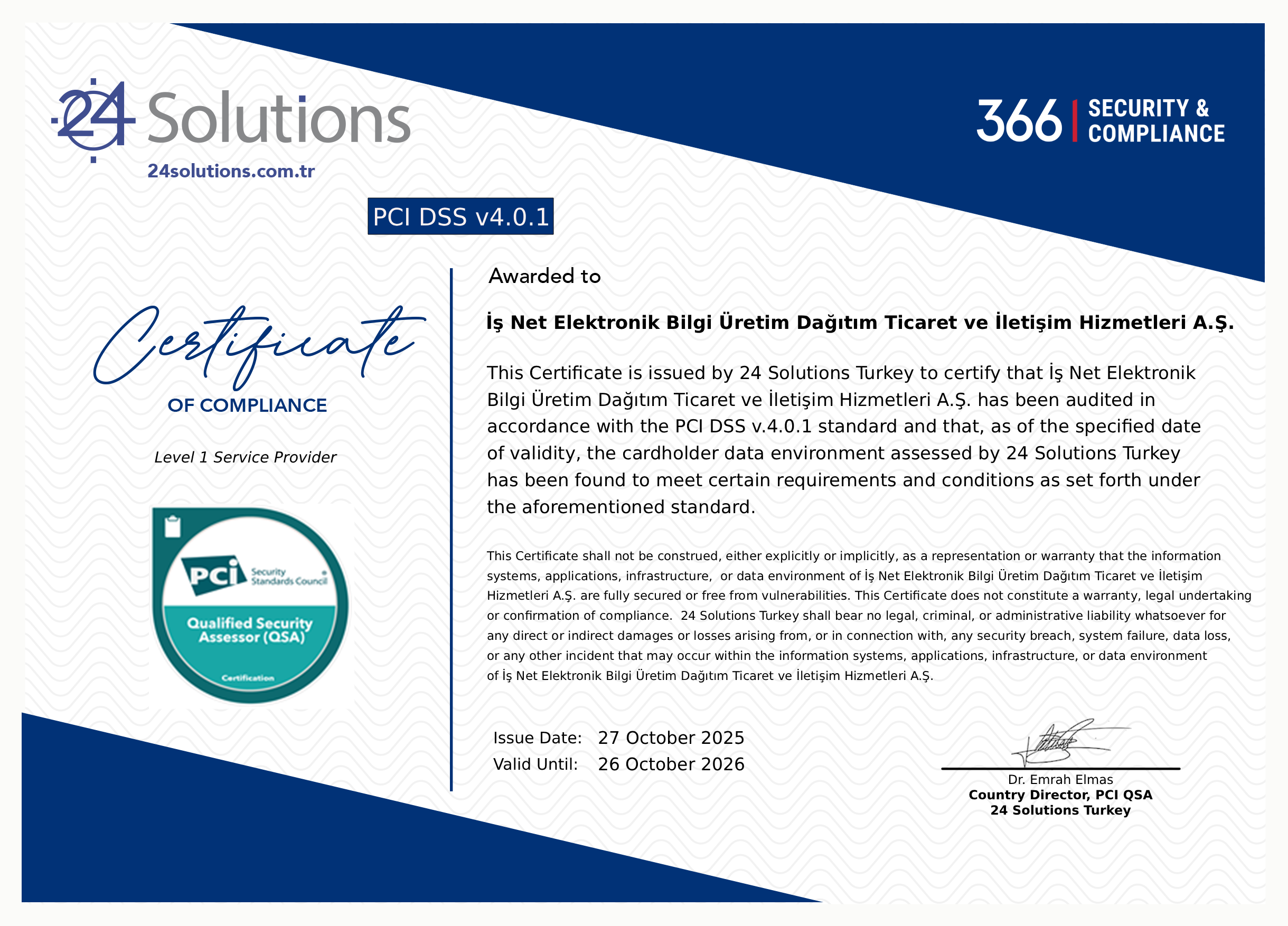 İşNet olarak, müşteri memnuniyetini sağlamak ve küresel gelişim ile yoğunlaşan rekabetçi pazarda başarılı olabilmek için Bilgi Güvenliği, İş Sürekliliği, Kalite, Bulut, Kişisel Veri, Servis ve Ödeme Güvenliği Sistemleri kapsamında;